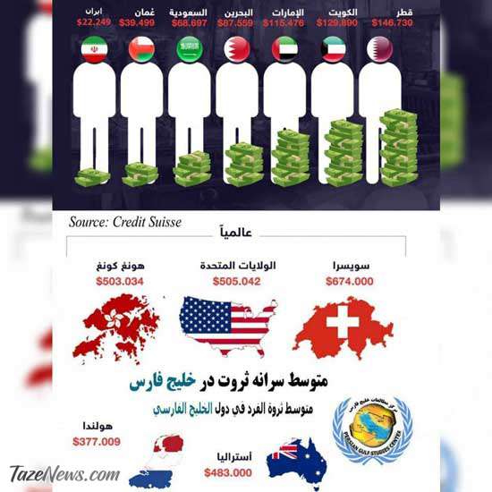 بر اساس گزارش ثروت جهانی سال ۲۰۲۱ که توسط بانک سوئیس اعتبارسنجی میشود، مردم قطر با متوسط سرانه ثروت ۱۴۶۷۳۰ دلار، در رتبه اول ثروتمندترین مردم منطقه خلیج فارس قرار دارند. مردم ایران با میانگین ثروت سرانه ۲۲۲۴۹ دلار دارای کمترین میزان ثروت در منطقه خلیج فارس هستند.